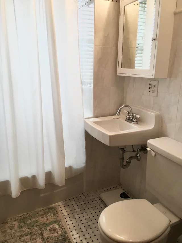 Trim & accessories: Baseboards (PVC or sealed wood), mirror, towel bars, TP holder.
